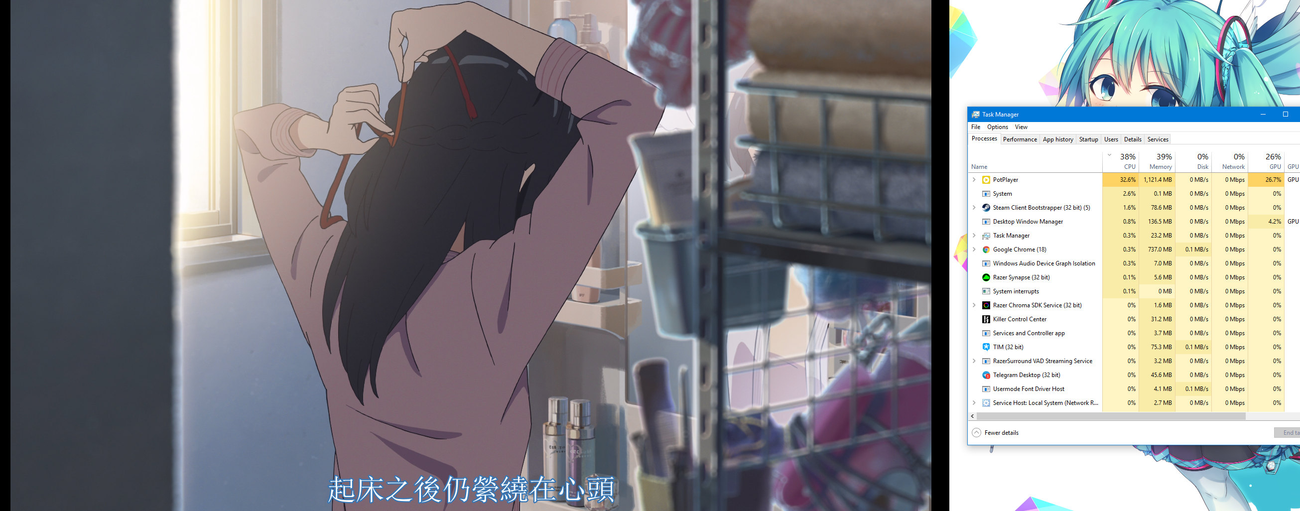 可以看出,mpv总体小优于配置后的potplayer。(不要吐槽为啥不是同一画面,较懒,图中性能表现是可以代表播放同一片段时两者的性能表现的)