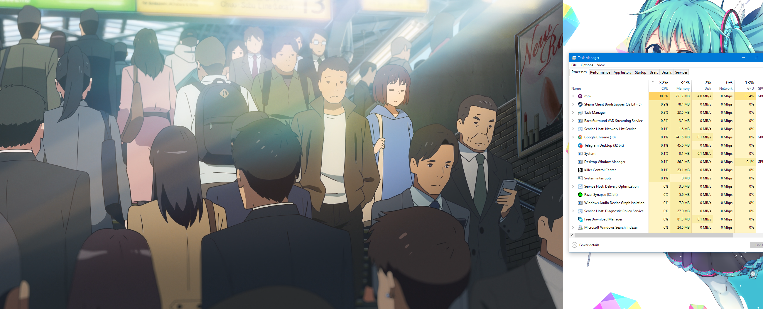 性能这方面,我做了一下简单的实验,仅供参考,默认的mpv VS LAV的potplayer,实验视频为4K画质的《君の名は。》的BD源: